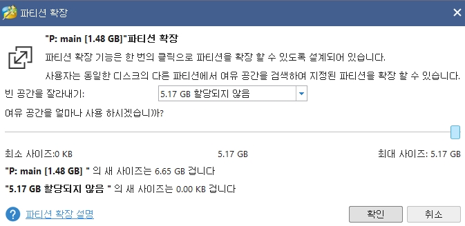 그러면 위 스샷이 나오는데 할당할 사이즈를 맨 오른쪽으로 옴겨서 5.17기가를 모두 사용한다고 설정합니다.
